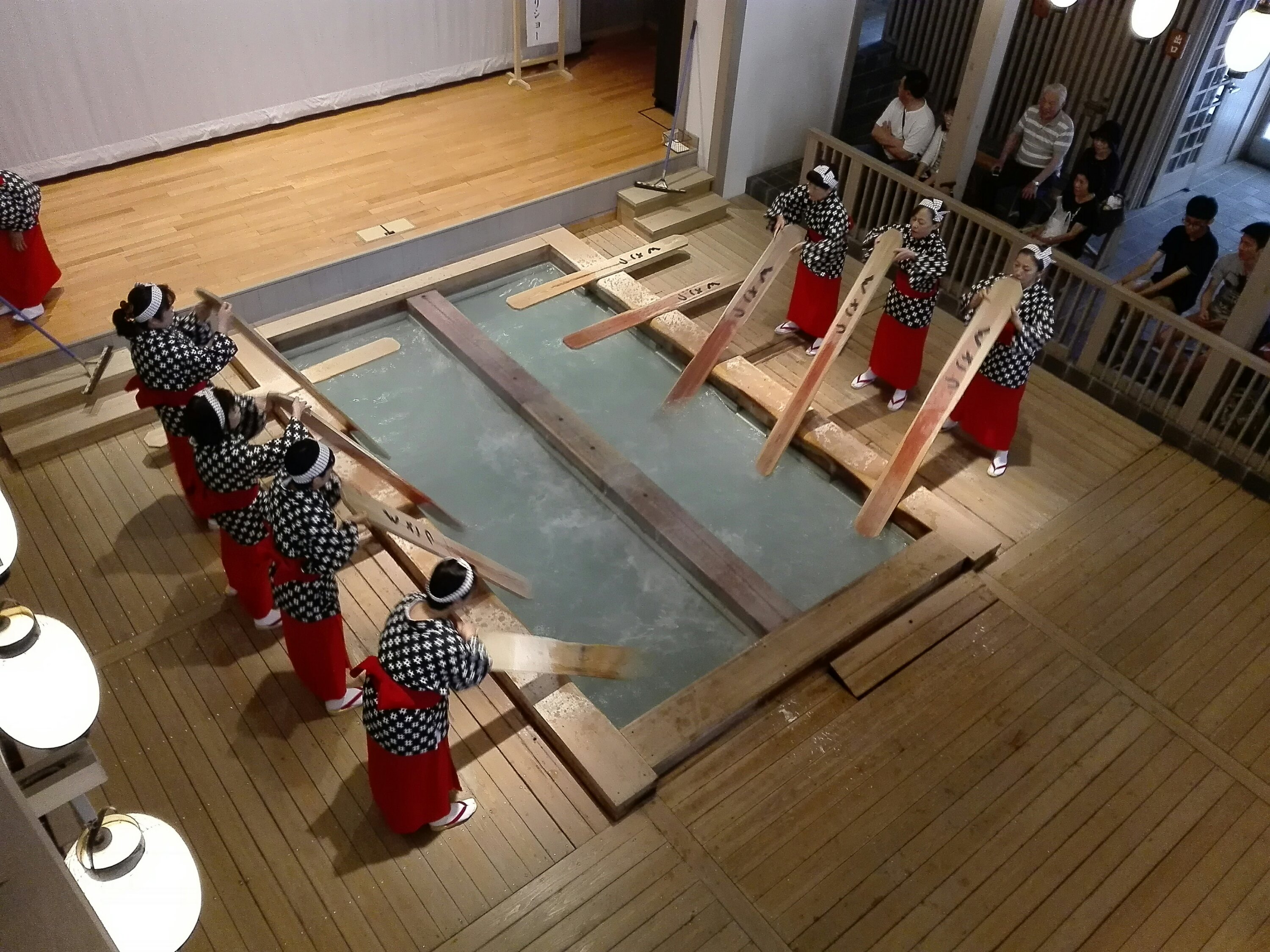 When you reach the bus terminal in Kusatsu Onsen, let’s walk aiming to “Yubatake”, a center of Kusatsu Onsen Area. “Yubatake” is an iconic spot and a facility which adjusts hot water temperature by pouring in wooden gutters outside. Dynamic scene that hot spring is felling like a waterfall and the strong smell of sulfur will welcome you there! Temperature of hot water in Kusatsu is really high, so we need to cool the water in order to dip into Onsen. However, if you pour cool water into hot water, the concentration of hot spring quality will decrease. To avoid it, we try to stir hot water in bathtubs by wide and long boards in order to make hot water’s temperature low but to keep the quality, which called “Yumomi”. You can also see a Yumomi performance at “Netsu-no-yu” near Yubatake and experience Yumomi during the show if you want. The ladies for the performance will teach you how to do it.