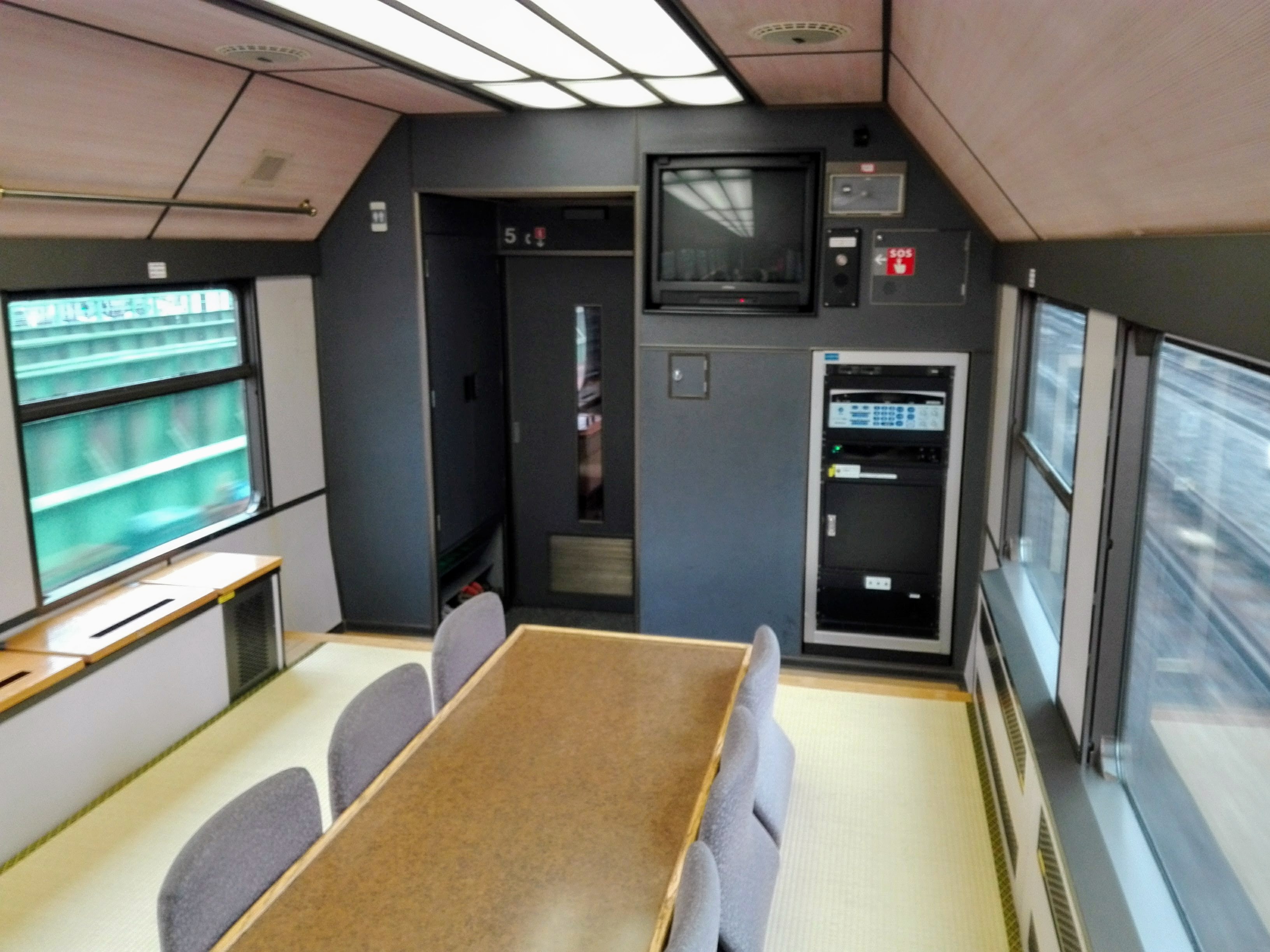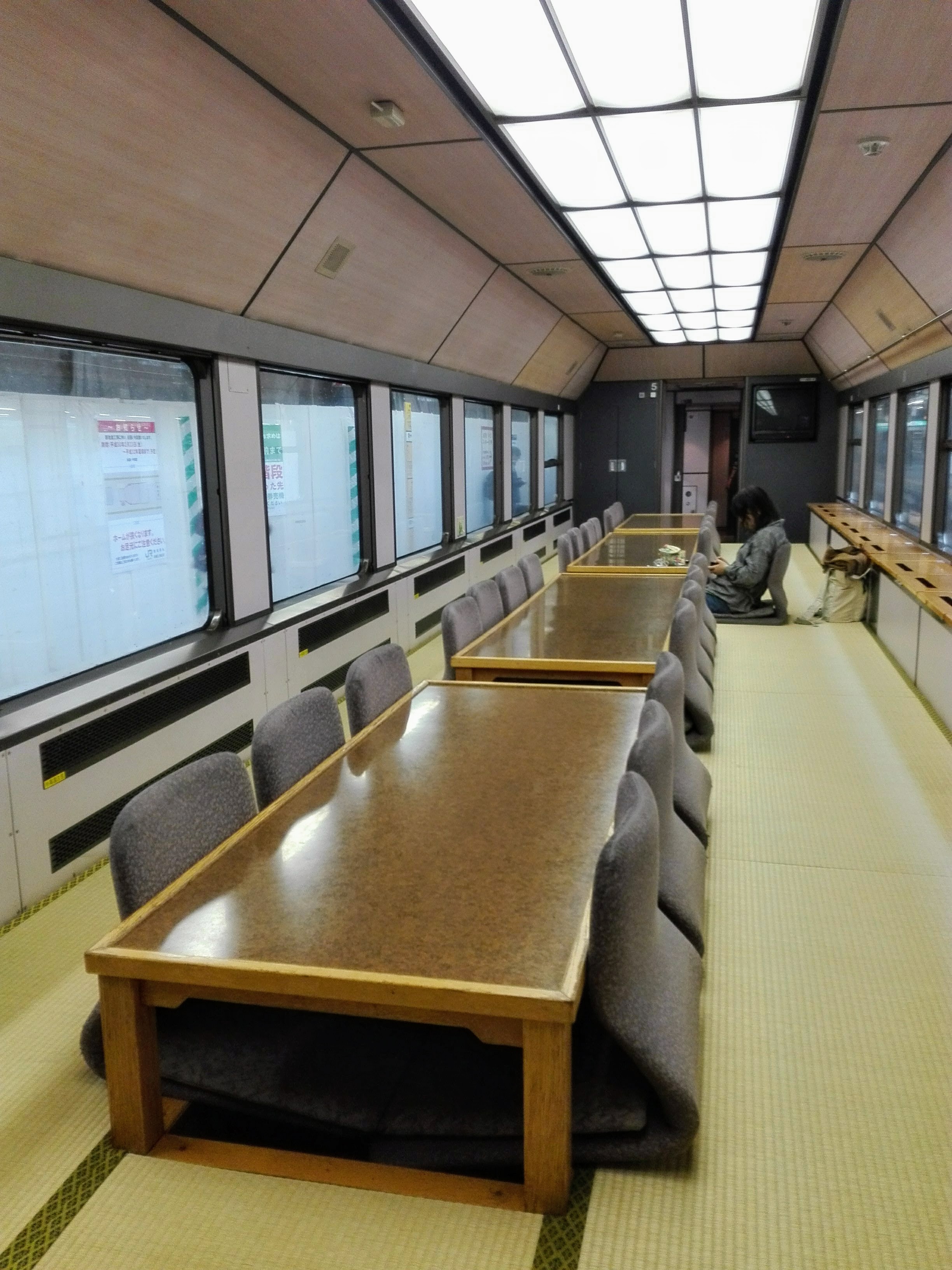 Our destination was “Shimpu-Togenkyo” in Nirasaki City and what we were most looking forward to this trip was getting on a joyful train called “Ozashiki Togenkyo Panorama Train”! Do you know the meaning of “Ozashiki”? Surprisingly, the inside of the car is a room with tatami-mats! You need to take off your shoes when you enter the inside. The train is used for group travels for schools, companies and organizations, so that individual passengers normally cannot get on it. However, the train is operated for them ONLY during the peach blossom season on a few weekends in April (The operation dates are slightly different by year, so you need to check the schedule every year on JR East website). Although we were not aiming to get on it at first, we found out the special train is the best one to arrive at the destination at a good time. How lucky we are!