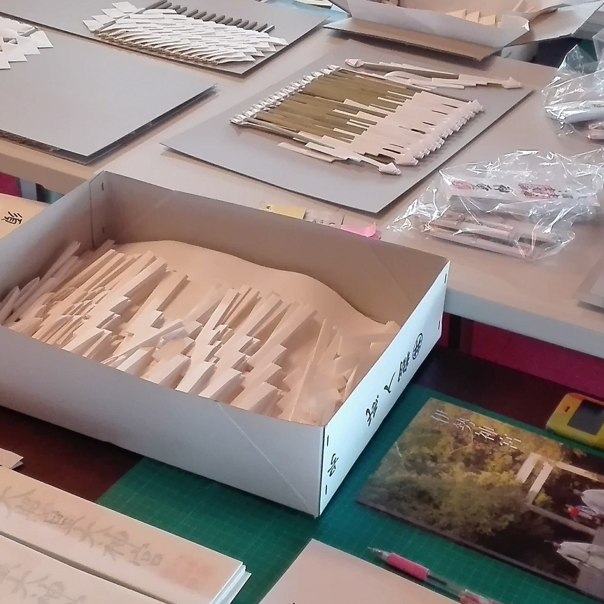 Our volunteer work is to write down each name of parishioners on large envelopes and to pack the ornaments they ordered into it. The ornaments for New Year consist of several parts, and the most important one is an amulet provided by Ise Jingu, the master shrine of in the highest position among all shrines in Japan, and almost all parishioners order it. Then, there are other ornaments with the shapes of thunders such as “Heisoku” / “Shime” and some of special amulets such as “Inari Omamori”. Surprisingly, most of them are hand-made and we used to make some of them by ourselves according to my friend’s instruction before, however, he has been able to prepare for most of them by himself in recent years in advance. The orders of ornaments differ from person to person, so that we need to make each package without making mess and mistakes by checking along to the order list. Additionally, the beauty of appearance is also very important, so we have to pay close attention when we pack them.