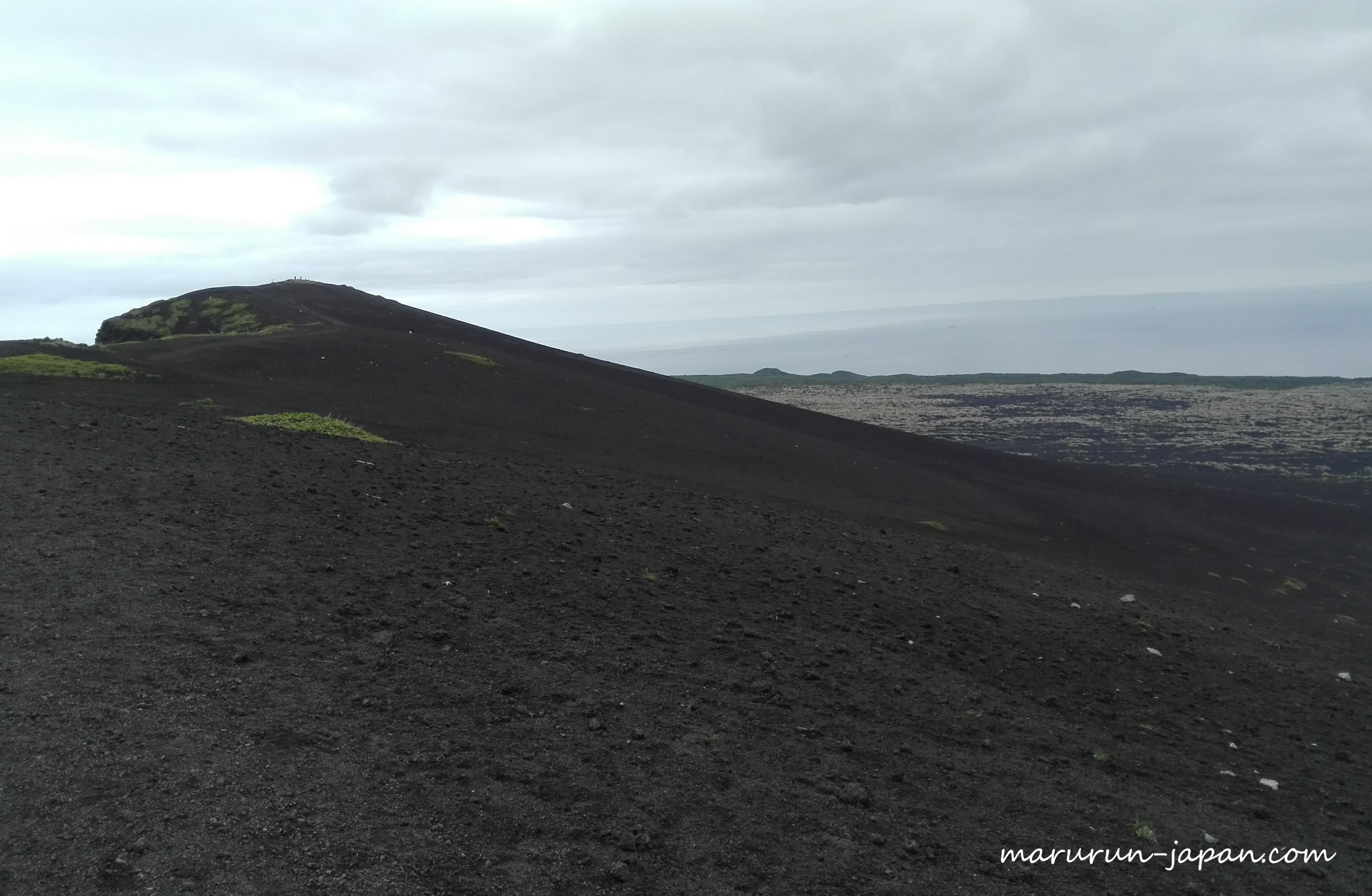 On the way back to the northern area of the island, we dropped by “Ura-Sabaku(Black Lava Desert)”. We drove off the main street, and moved into the narrow road called “Tsuki-to-Sabaku Line (Moon and Desert Line), they were heading for the huge area covered by black lava by foot after leaving our car at the parking lot. Mt. Mihara located at the center of the island and it is still an active volcano that has erupted a few times in these recent years. Black Lave Desert was created by repeated eruptions of the mountain in the past. According to some books, magma from eruptions burned out almost all of the plants and grounds, and no plants grow due to blowing strong wind so that most of the area is covered by the black color of lava.