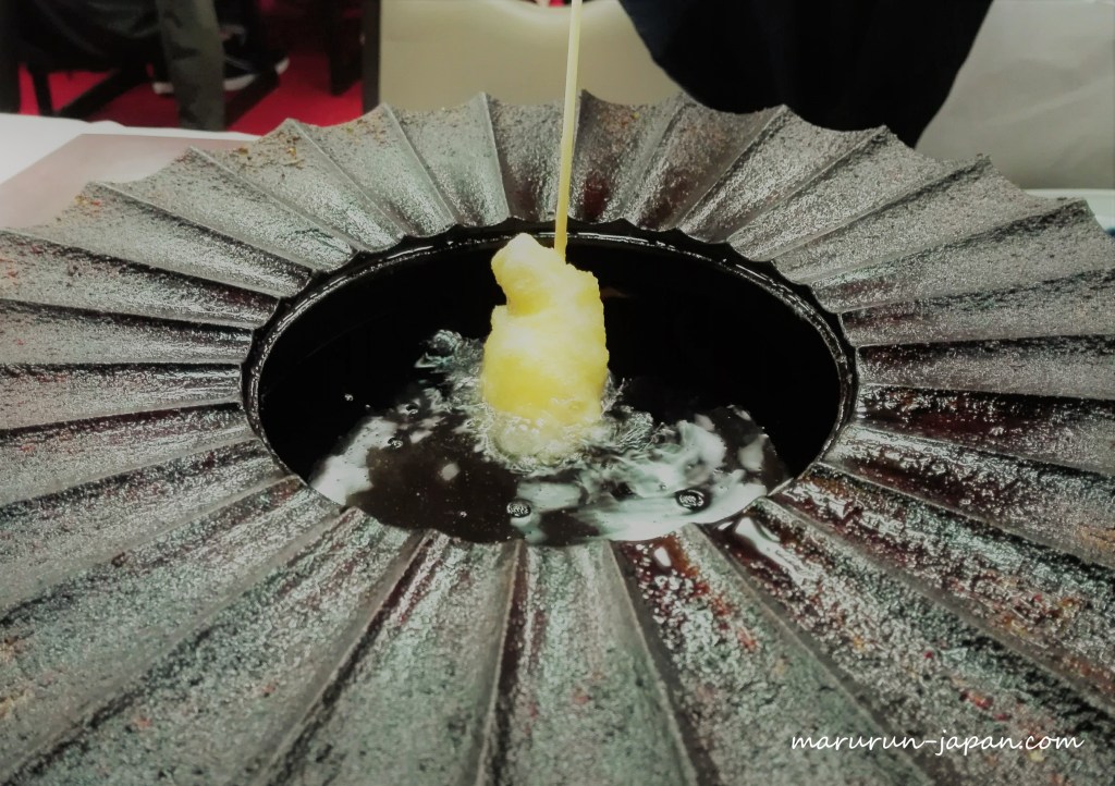 They served us “Camellia oil fondue” for dinner because the camellia flower is one of the special products on the island. It is the dinner style of the hotel that we soaked seafood and vegetable in a batter, then put them into the oil to deep fry by ourselves. Camellia oil was very light and didn’t have any annoying smell, so our stomach didn’t feel heavy although we ate plenty of foods. “Ashitaba”, a green leaf vegetable that seems like spinach with a bit bitter taste, is another special product on the island. As the vegetable contains a full of vitamins and minerals, it has been popular among people like healthy food. Especially, deep-fry Ashitaba was so crispy and tasty! Camellia oil fondue is also enjoyable as a kind of food entertainment.